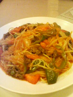 細麺+たまねぎ+ピーマン+トマト+牛肉