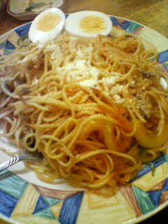 細麺+たまねぎ+ピーマン+豚肉+ゆでたまご