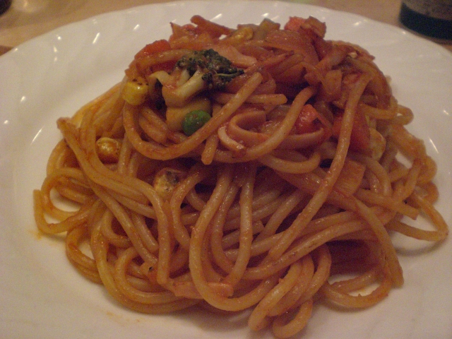 中太麺+たまねぎ+ブロッコリー+ミックスベジタブル+ベーコン のナポリタンです。
