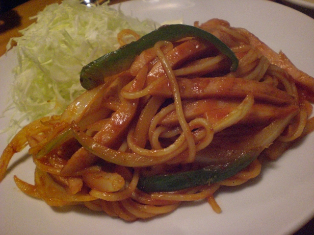 珍しい魚肉入りのナポリタンは炒めはしっかりしていて、ケチャップはちょっと濃い目のシャツに飛ばない系。これはアルコールがとっても進みます。