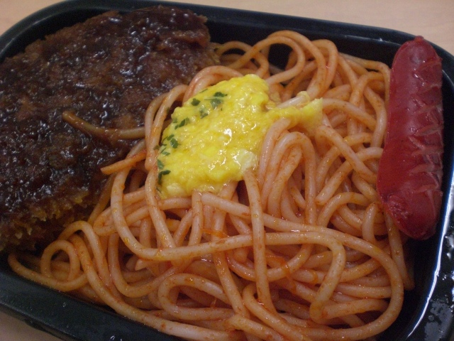 早速実食してみると、、、うん、ボリュームあるね!炒めな感じのナポリタンはシャツには飛ばない系。タマゴにウインナーはナポリタンの具材的にしっかり活きています。メンチカツも結構大きいのでボリューム結構あります(470kcal)。