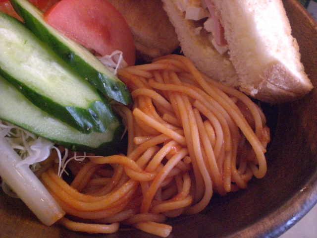 早速実食してみると、、、うん、具無しだね!炒めはしっかりケチャップ絡んだナポリタンはシャツに飛ばない系。具無しの素ナポは、トーストの付け合せ的な感覚でしょうか?具無しは残念。やっぱり単品ナポリタンにしとけばよかったかもー。