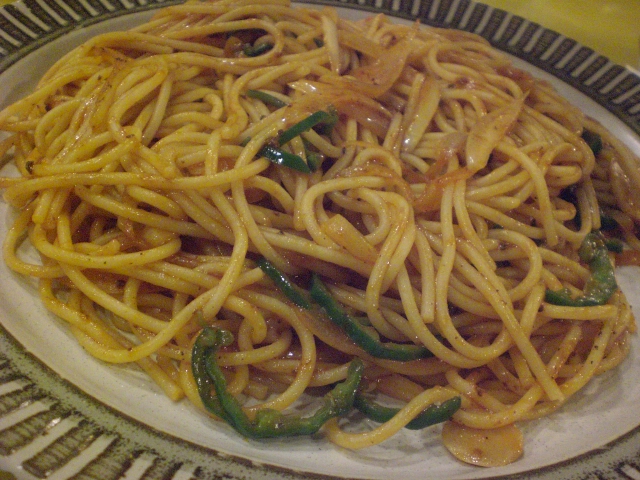 中細麺+ピーマン+マッシュルーム+たまねぎ+挽肉