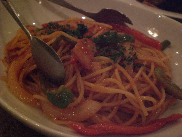 ビールで乾杯で待ってますが、大賑わいのパブは調理音など聞えません。待つこと10分位でナポリタン到着です。
