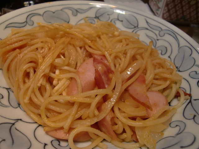 中細麺+エノキ+たまねぎ+ウインナー+ベーコン