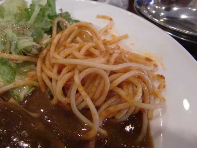 早速実食してみると、、、うん、巣ナポ!見た目に違わず完全なる巣ナポはもちろんシャツに飛ばない系。ハンバーグのソースに浸って、ちょっぴりドミグラナポ味だったり・・・。ハンバーグの食べる前にナポリタンを先に全部食べちゃいました。。