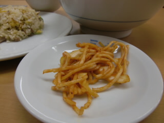 早速実食してみると、、、うん、これも炭水化物!ケチャップ絡んだナポリタンはもちろんシャツに飛ばない系。具材が一つ入っているので素ナポではありません。パスタも炭水化物でトリプル炭水化物メニュー。苦戦しながらもなんとか完食でした。