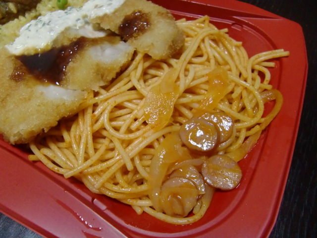 中細麺+たまねぎ+ウインナー のコンビニのナポリタンです。