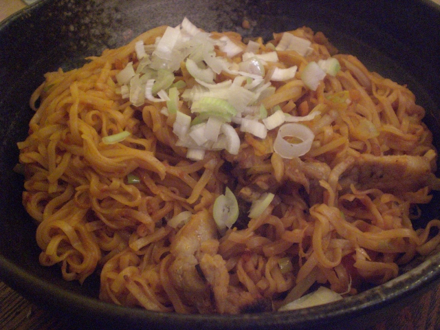 インスタント麺+ピーマン+たまねぎ+もやし+ねぎ+チャーシュー のインスタントラーメンなナポリタンです。