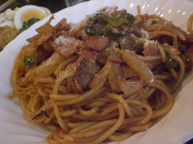早速実食してみると、、、うん、ソースだーー!炒めしっかりなナポリタンはシャツに飛ばない系。ベーコンがカリッカリでいい感じ。ケチャップだけじゃなくて、ウスターソースの味わいもします。