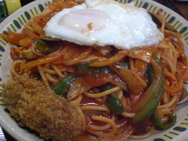 のナポリタンです。目玉焼きとカキフライを別のお皿からナポリタンの上に乗っけてしまいました。