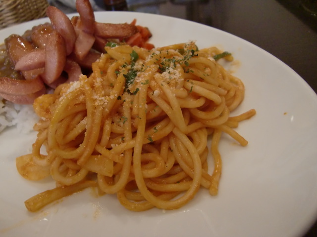 早速実食してみると、、、うん、ナポレオン!炒めちゃんとしたナポリタンはシャツに飛ばない系。ナポレオンな理由は不明ですが、スタンダードなナポリタンです。肉系具材はカレーに乗ってるタコさんウインナーで代用できるので心配無用です。