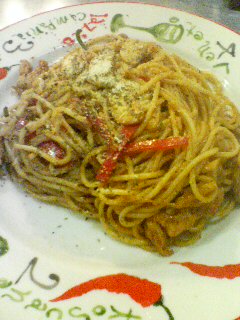 細麺+赤・緑ピーマン+たまねぎ+マッシュルーム+鶏肉+ブラックペッパー+パセリ です。あと、ケチャップ以外にデミグラスソースが入ってる感じの色具合です。